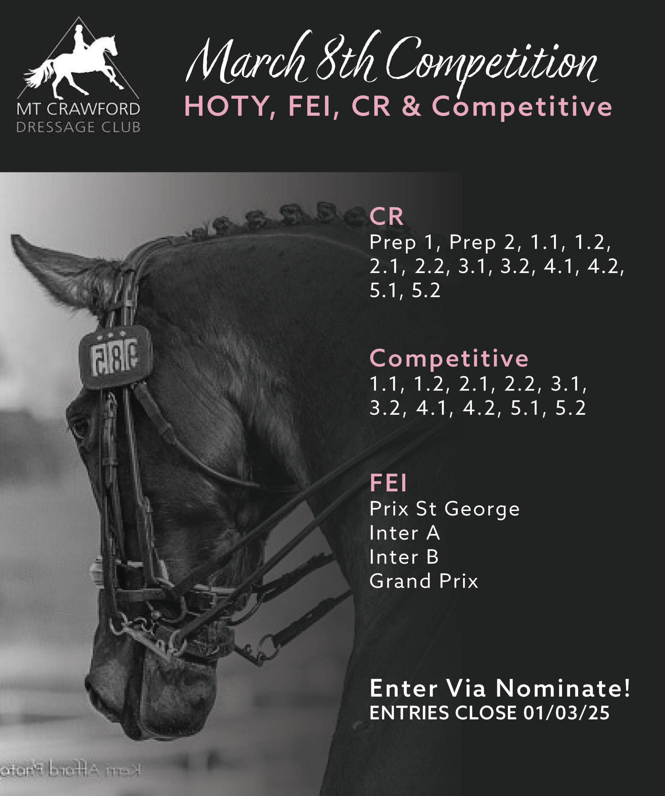 Saturday 8th March FEI / Competitive / CR / Para Competition March 8, 2025 MCDC Monthly Events - 2025 (completed) Click here to view draw Yard Allocations Share ThisTweetShareEmail
